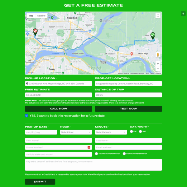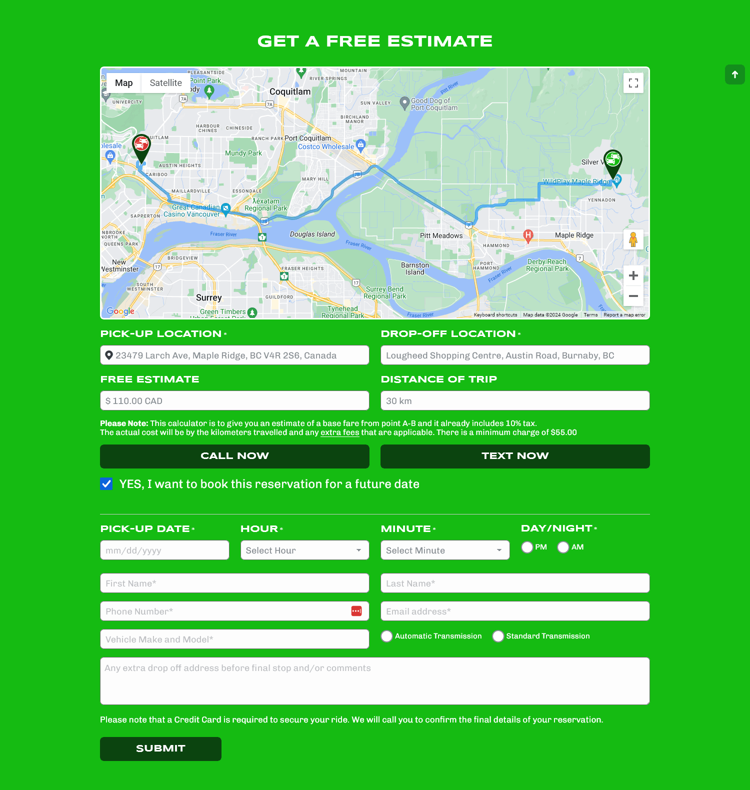 This was a fun project to work on and had a few challenges. One such challenge was creating a form that contained a Google Map that could calculate the distance between two points and calculate a rough cost for their transportation services!